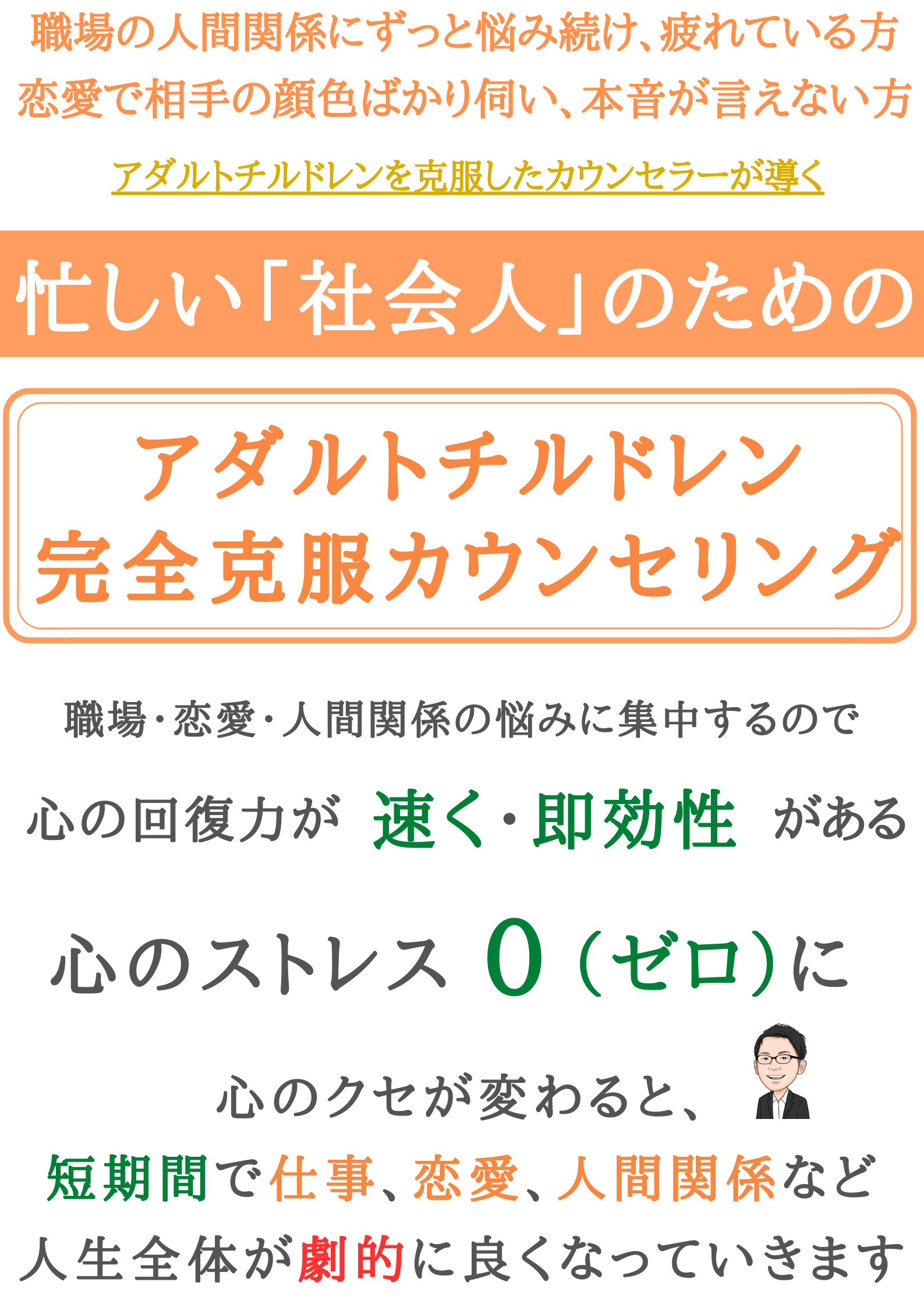 友達や知り合いではなく、アダルトチルドレンに悩みそれを克服した経験のあるカウンセラーに相談することで、深く深くあなたの悩みに共感でき、最短で克服する方法をご提案できます。僕は、100%あなたの味方です。あなたの悩みを僕に教えて下さい。真剣にお聞きします。