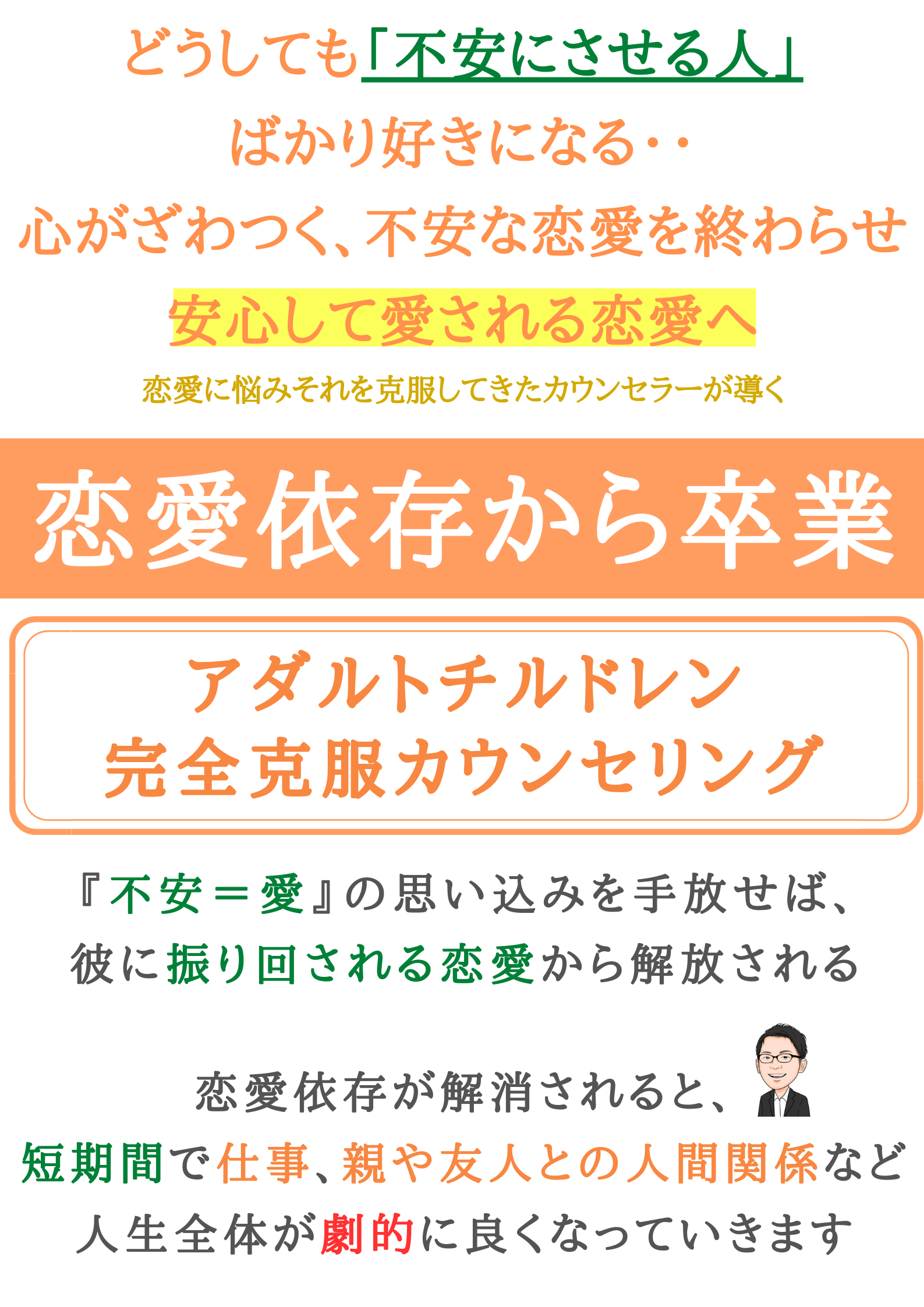 このような魅力があるので、あなたにも自信をもって、【恋愛依存から解放 アダルトチルドレン専門カウンセリング】をお勧めできます。
